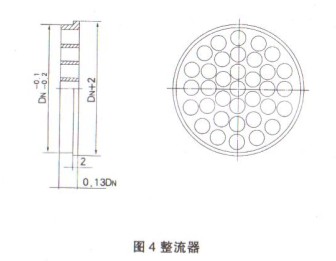 整流器的安裝:場地限制,直管段無法滿足,應(yīng)安裝整流器,見圖4,是一種非均勻分布多孔整流器,結(jié)構(gòu)簡單,成本低,安裝方便,阻力損失小,安裝見圖5。