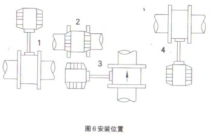 安裝條件:渦街流量計(jì)應(yīng)遠(yuǎn)離振動源,有振動時在前后直管段2DN處加支架用橡皮減振。傳感器通徑圓應(yīng)與直管段內(nèi)徑圓保持同心。法蘭焊接時,密封夾緊時,管內(nèi)不得有突出部分。流向應(yīng)與箭頭方向一致。(高溫時推薦2、3、4位置,常溫和低溫時推薦1位置,垂直管道時選3位置)見圖6