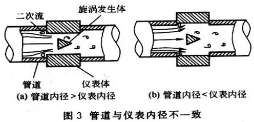 而渦街流量計與安裝管道內(nèi)徑也會存在誤差,或大或小,如圖3所示,當(dāng)被測介質(zhì)經(jīng)過時,也會發(fā)生二次流動,對測量結(jié)果產(chǎn)生波動影響。