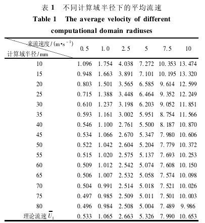取計算域半徑在 10 ~ 80 mm 的范圍內(nèi),通過GAMBIT 軟件分別建立模型,再由 FLUENT 軟件分別進行仿真,得出在不同半徑的計算域內(nèi)所對應(yīng)的體積加權(quán)平均流速,如表 1 所示。
