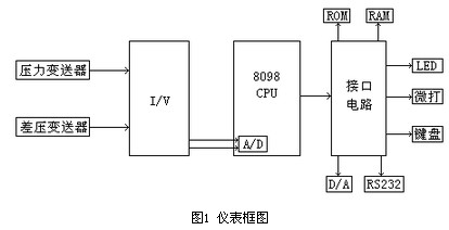 來自壓力變送器和差壓變送器的4~20毫安直流信號(hào)經(jīng)I/V轉(zhuǎn)換成1~5伏電壓信號(hào),再經(jīng)A/D變換成數(shù)字量。數(shù)字濾波和統(tǒng)計(jì)估計(jì)可得數(shù)學(xué)模型計(jì)算所需的P、 和 。并按壓力P由相應(yīng)子程序計(jì)算密度和熱焓,從而算出汽水兩相流的干度、質(zhì)量流量和攜帶熱量,并對(duì)流量和熱量進(jìn)行累積運(yùn)算。鍵盤和LED用于常數(shù)設(shè)置和結(jié)果顯示,微打可定時(shí)或立即打印結(jié)果。D/A接口輸出干度信號(hào),RS232接口可與上位機(jī)進(jìn)行通訊。儀表原理框圖如圖1所示。